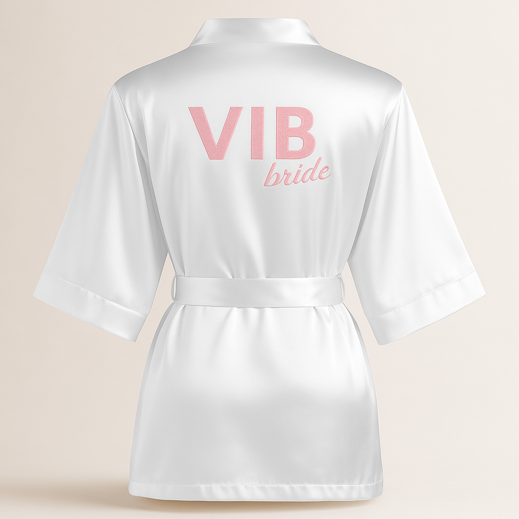 Elegantný saténový župan s jemnou strojovou výšivkou „VIB bride“ v bledoružovej farbe. Pohodlný a štýlový kúsok pre svadobné prípravy nevesty.